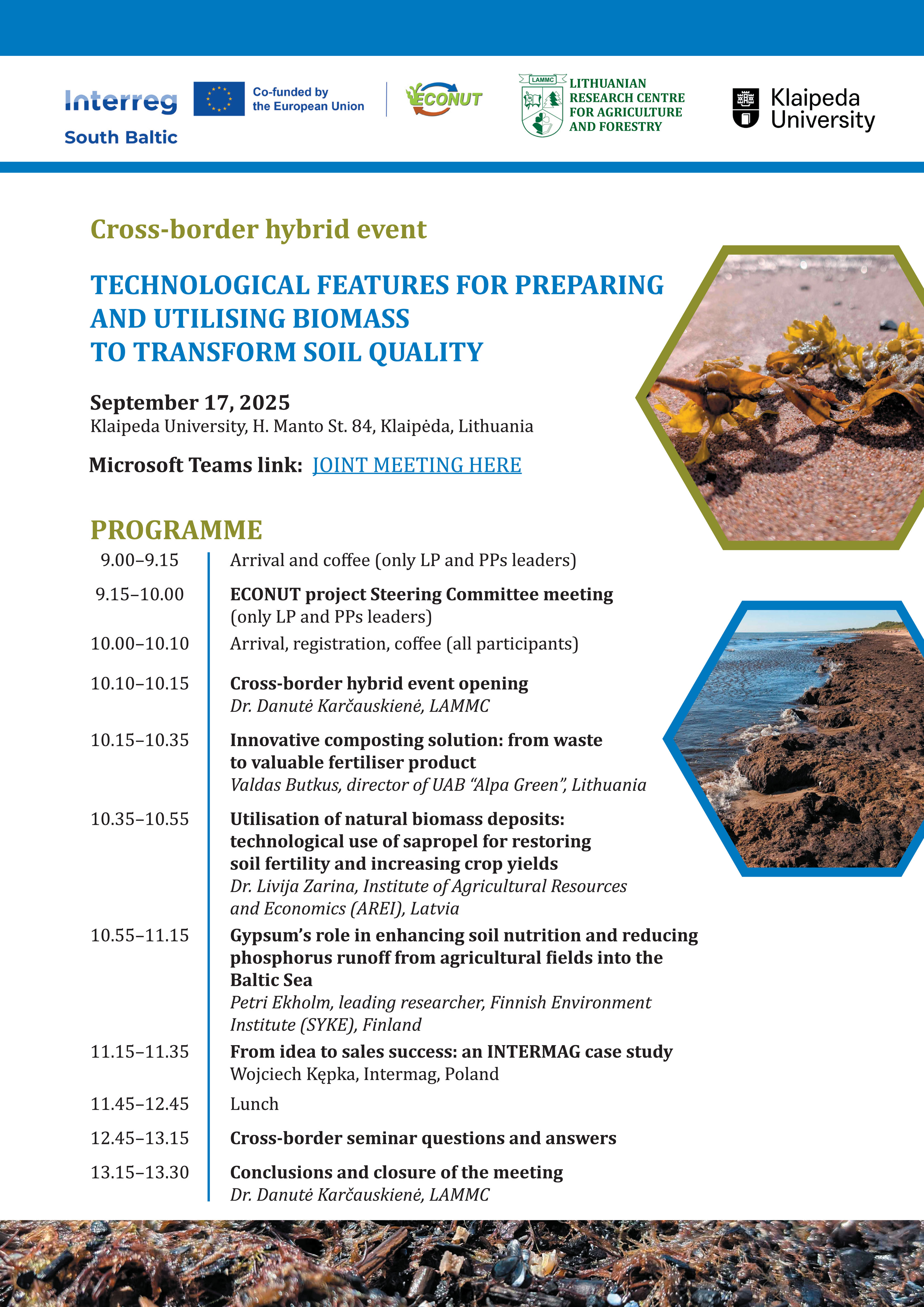 Kviečiame dalyvauti Interreg VI-A Pietų Baltijos bendradarbiavimo per sieną programos finansuojamo projekto ECONUT seminare TECHNOLOGINIAI BIOMASĖS PARUOŠIMO IR PANAUDOJIMO ASPEKTAI, SKIRTI DIRVOŽEMIO KOKYBEI GERINTI.